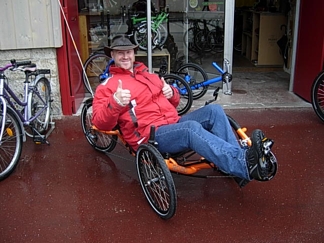 Ce samedi, Geoffrey vient récupérer son trike . Après un essai en situation (sous la pluie), nous arrêtons notre choix sur le modèle Road de chez Catrike.