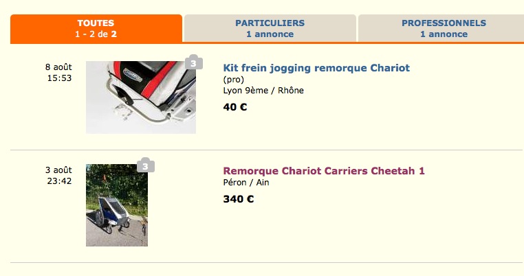 remorques Thule Chariot vous effraie un peu, demandez à l’équipe de Cyclable de vous conseiller car chaque remorque est mieux adaptée à un profil d’utilisation donné. Merci à Ben et Fabrice pour leur excellent service. Sachez aussi que la valeur de revente d’une Thule Chariot est élevée car c’est un produit de qualité réputé et on n’en trouve que très très rarement d’occasion sur le net. Faites une recherche pour voir. En général, votre remorque Thule sera rachetée par quelqu’un de votre propre entourage, il n’y aura même pas besoin de passer une annonce !