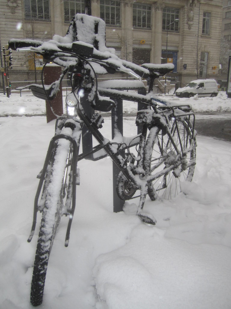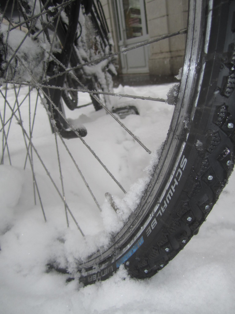 40 cm de neige qui paralysent les rues Saint-Etienne … Ce 20 novembre est l’occasion rêvée pour tester les fameux pneus à clous Marathon Winter de chez Schwalbe !