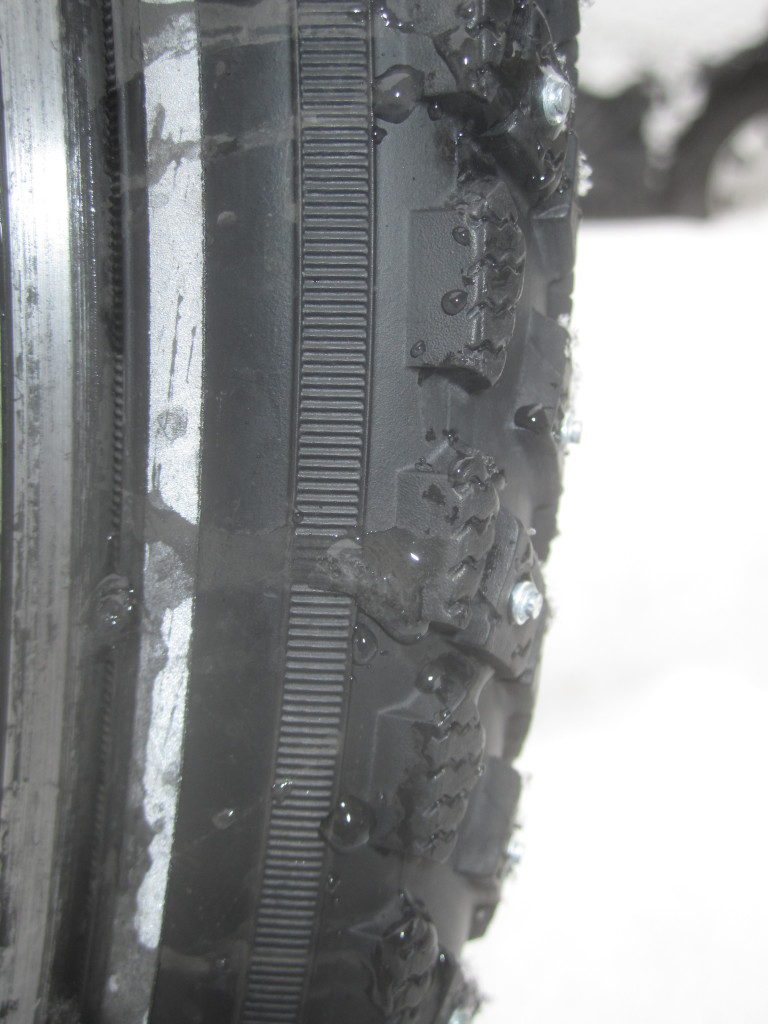 Le pneu Marathon Winter à été conçu par Schwalbe pour un usage sur routes verglacées. Les clous (qui peuvent être remplacés) sont pris dans la masse de caoutchouc et dépassent de la bande de roulement d’1 mm environ.