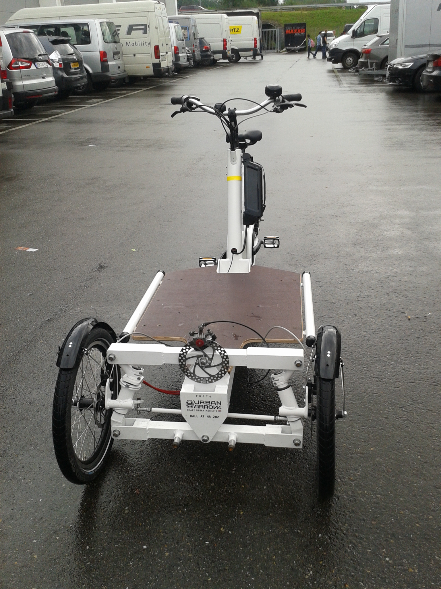 urban arrow 3 wheels La marque hollandaise a présenté cette année à Eurobike un prototype de l’Urban Arrow 3 wheels ou Urban Arrow Tilting. Une vraie innovation puisqu’il s’agit d’un triporteur pendulaire : le cadre de l’Urban Arrow traditionnel est conservé, un large plateau à l’avant avec deux roues au système pendulaire complètent le prototype. A l’arrêt, une manette permet de bloquer le système pour garder toute sa stabilité. Le chef produit d’Urban Arrow nous a expliqué que l’équipe espère une sortie de ce modèle lors du salon Eurobike 2015. Une belle innovation à suivre… urban arrow tilting bike