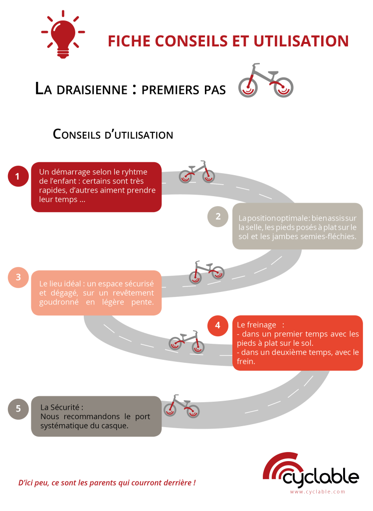 Pour choisir un vélo d’apprentissage, il est indispensable que le modèle soi adapté à la taille de l’enfant : la meilleure position est une posture assise avec les pieds posés bien à plat sur le sol. Sur une draisienne de trop grande taille, l’enfant ne sera pas rassuré car il ne sera pas assez stable pour bien se tenir.