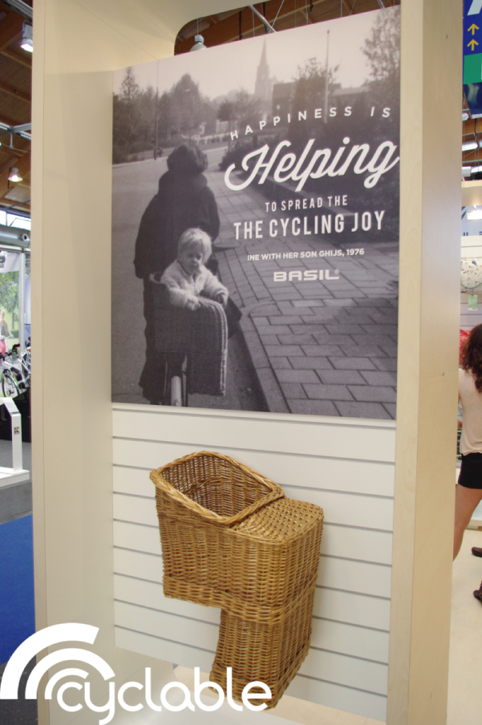 Mais celle-ci reviendra le voir cinq fois dans l’année avec la même demande insistante. Il comprit alors qu’il était important d’essayer d’y répondre et a fini par trouver par un ami un siège inédit (assise en amazone) en rotin. Il fournit la cliente, ravie, et en re-commanda 50 qui furent vendus sur l’année.C’est ainsi que Nico van Balveren’s se rendit compte qu’il y avait une véritable demande sur l’accessoire de vélo, et qu’il se mit à imaginer une ligne de sacoches de ville destinée à rendre service à tous les cyclistes du quotidien. Basil présente sur son stand un exemplaire de ce siège et la photo de 1976 de sa cliente, retrouvée tout récemment, comme nous l’explique Joost Aldus, responsable des ventes.