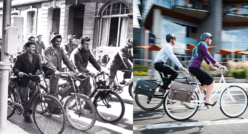 A partir de 1890 jusqu’en 1945, la popularité du vélo s’étend aux classes populaires et se voit adopter massivement. En France, son succès se voit pourtant ralentir (notamment dans les grandes villes) de par l’invention de la voiture, du tramway et du métro.