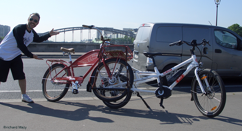 Pour promouvoir l’évènement, Michel Fugain était l’invité de l’émission radio « Le beau vélo de RAVeL ». A ses côtés pour l’interview, un magnifique modèle de vélo Cruiser de chez Electra. En tant que véritable passionné de ces vélos dit « lifestyle », Richard, gérant du magasin Cyclable Paris 12, s’est fait un plaisir de livrer cet incroyable modèle. Son moyen de livraison ? Le vélo évidemment ! L’Electra s’est fait tracter par un longtail à assistance électrique : le Yuba spicy Curry. Une livraison qui a fait sensation et qui a permis de faire découvrir ces deux marques à notre ami chanteur !