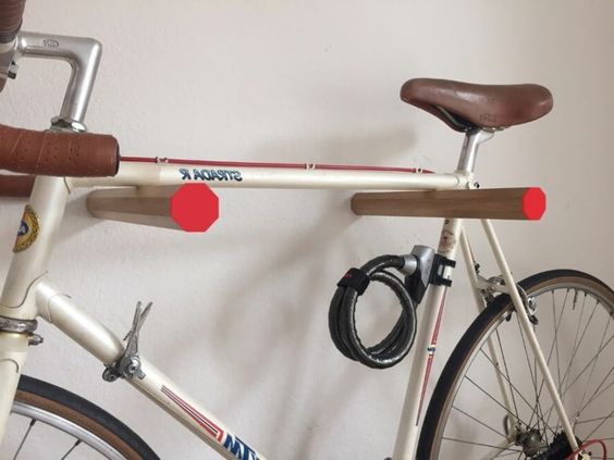 Autre idée toujours très accessible : 2 grosses baguettes en bois à fixer de manière perpendiculaire à votre mur. Maire encore faut-il avoir un vélo à cadre fermé !