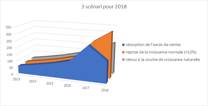 - Retour à une croissance de + 32% à partir des 255 000 VAE vendus en 2017, c’est le scénario optimiste qui amènerait le marché français à 336 000 VAE vendus en 2018.
