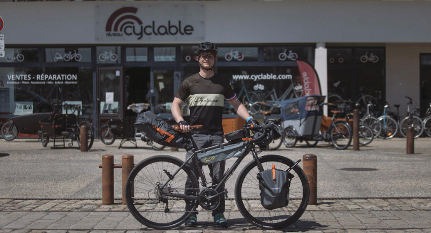 Baptiste est adepte du bikepacking pour aller visiter l’ensemble des magasins Cyclable à vélo : « Le Bikepacking est au vélo ce que le sac à dos (backpacking) est à la randonnée pédestre. Le randonneur sur deux roues voyage léger (adieu le superflu !) et apprécie ces sacoches adaptables qui se fixent directement sur le cadre du vélo. Plus besoin de porte-bagages !