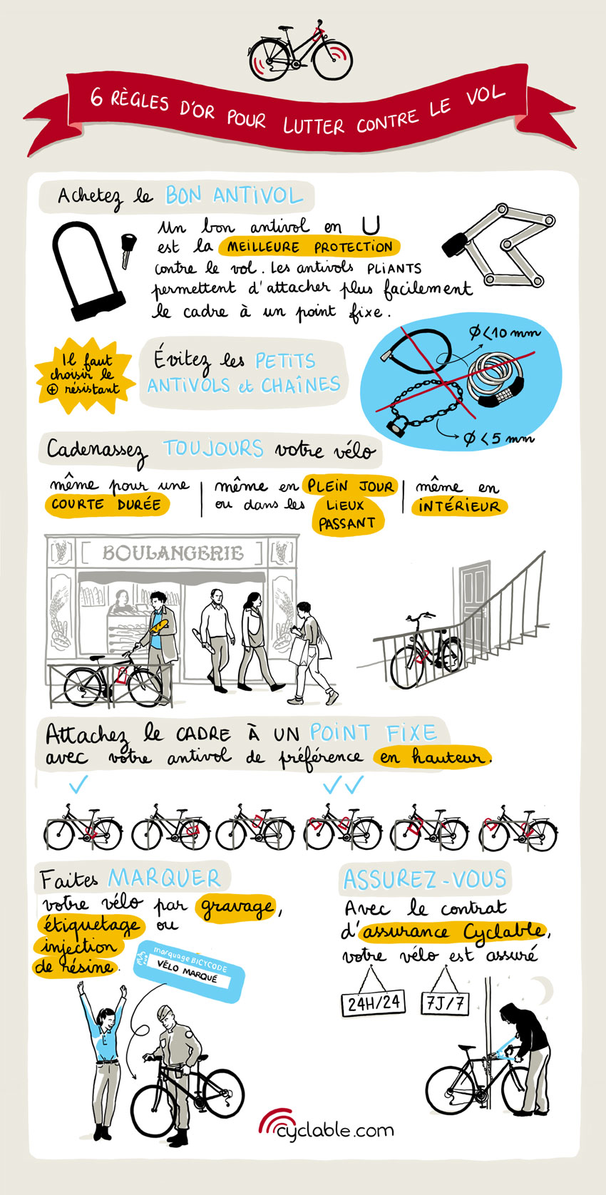 Il faut avoir le réflexe d’attacher systématiquement son vélo, y compris pendant les arrêts de courte durée et chez soi. Un vol sur deux a lieu dans les halls ou parties communes d’immeuble. C’est contraignant, mais permet de s’assurer de retrouver sa monture à coup sûr !