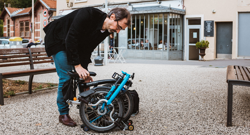François a adopté le vélo pliant depuis son arrivée à Lyon. Il est littéralement devenu un « Brompton addict ».