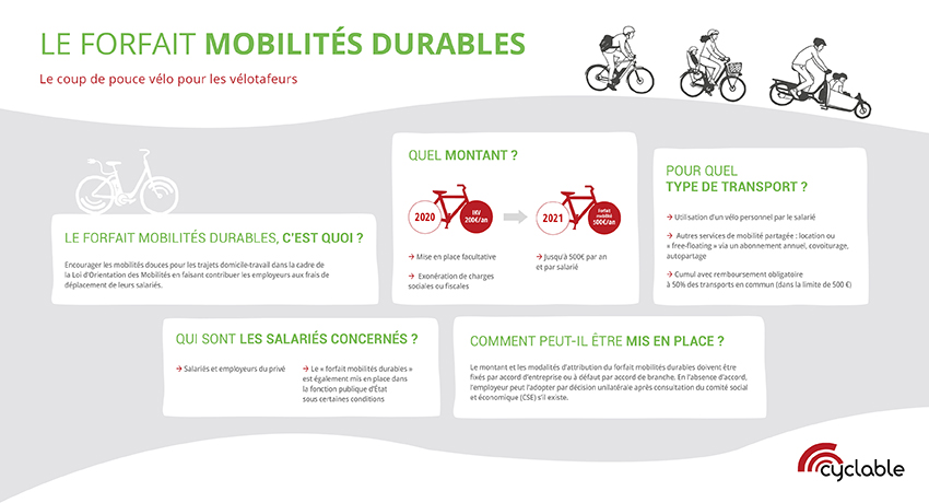 Concrètement, ce forfait mobilités durables, qui prend le relais de l’ancien IKV, offre aux employeurs la possibilité de prendre en charge dans des conditions avantageuses les frais de déplacements domicile-travail de leurs collaborateurs adeptes du vélotaf (voir ci-dessous les autres modes de transport concernés). Les sommes engagées dans ce cadre sont en effet exonérées de cotisations sociales et d’impôts sur le revenu dans la limite de 500 € par an et par salarié.
