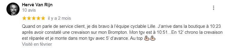 Au cœur de ce nouveau concept, nos clients. Nous recevons régulièrement des témoignages enthousiastes après une intervention technique sur leur vélo. En témoigne par exemple Hervé :