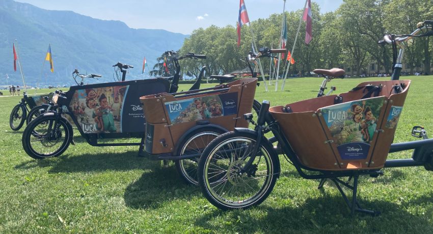 Le vélo s’invite au cinéma ! Dans le cadre du festival de cinéma d’animation, du 16 au 19 juin 2021, Cyclable Annecy a mis à disposition sa flotte de vélos cargo pour célébrer la sortie du film de l’été : Luca.