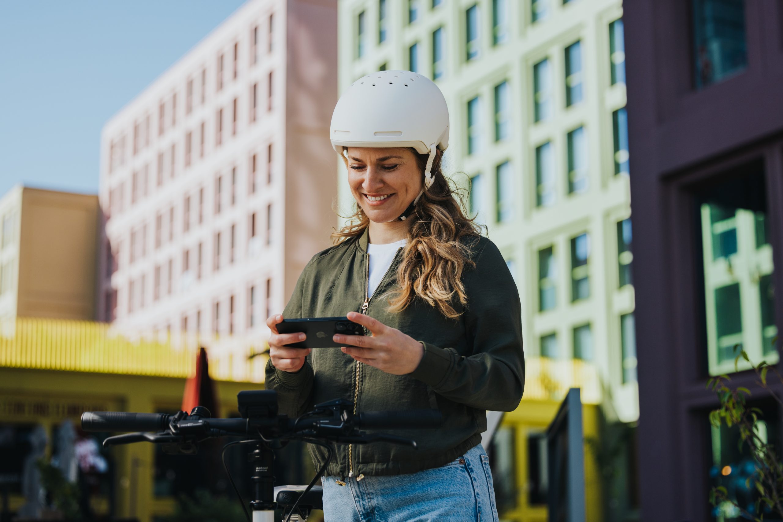 Devant, une rangée d'immeubles, une cycliste regarde son smartphone dans lequel est consigné le carnet d'entretien de son vélo électrique.