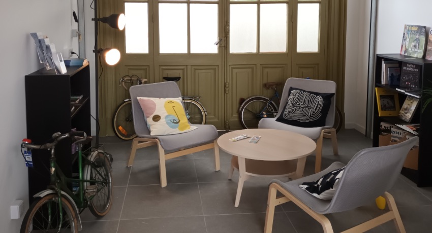 Aménagé dans un ancien local technique de la SNCF, la Maison du vélo fait la part belle à la détente et à la convivialité. « Nous avons mis en place un petit espace café, ainsi qu’une cyclothèque. Dans cette bibliothèque intégralement consacrée à l’univers du cycle, on trouve des magazines spécialisés, des beaux livres, des BD, des guides ou des cartes pour trouver l’inspiration ou commencer à préparer un futur voyage à vélo. »