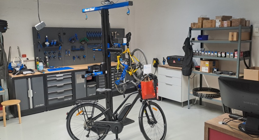 - Entretien et réparation : l’atelier, avec son pied double électrique, accueille des vélos de toutes les marques. Aux manettes, Eric excelle dans la prise en charge des VAE comme des vélos musculaires et possède une expertise particulièrement pointue dans le réglage et la préparation des VTT.