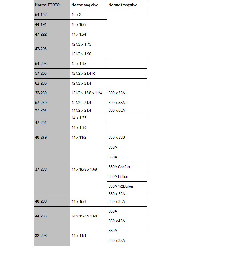 Tableau d'équivalence pour petites tailles (diamètre 10"-14")[/caption]