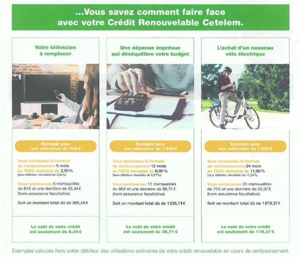 Flyer d'un organisme de crédit présentant une solution de financement pour un vélo électrique[/caption]